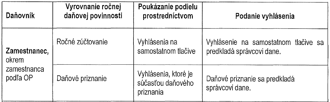 Pozn.: V prípade zamestnancov podľa osobitného predpisu (príslušníci SIS, profesionálni vojaci alebo zamestnanci Ministerstva obrany SR), ktorí sa rozhodnú svoju ročnú daňovú povinnosť vyrovnať prostredníctvom ročného zúčtovania preddavkov na daň z príjmov zo závislej činnosti (ďalej len „ročné zúčtovanie“) platí, že títo zamestnanci podávajú vyhlásenie podľa § 50aa ods. 1 zákona o dani z príjmov zamestnávateľovi podľa osobitného predpisu.