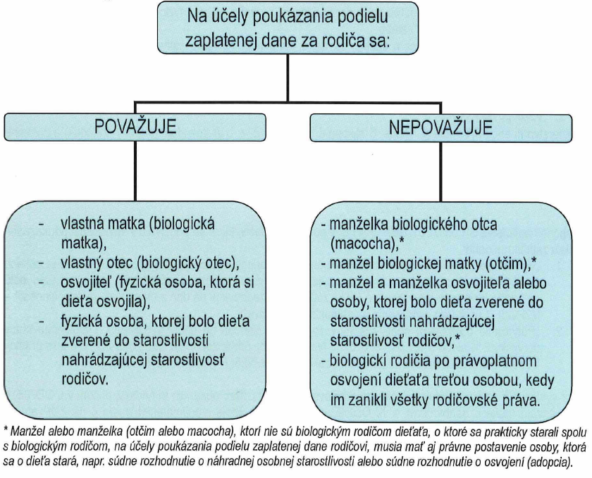 To znamená, že na účely poukázania podielu zaplatenej dane sa za rodiča považuje: vlastná (biologická) matka, vlastný (biologický) otec, osvojiteľ alebo fyzická osoba, ktorej bolo dieťa (daňovník) zverené do starostlivosti nahrádzajúcej starostlivosť rodičov. Za rodičov sa na účely poukázania podielu zaplatenej dane nepovažuje: manželka biologického otca (macocha)*, manžel biologickej matky (otčim)*, manžel alebo manželka osvojiteľa alebo osoby, ktorej bolo dieťa zverené do starostlivosti nahrádzajúcej starostlivosť rodičov* a taktiež biologickí rodičia po právoplatnom osvojení dieťaťa treťou osobou.
