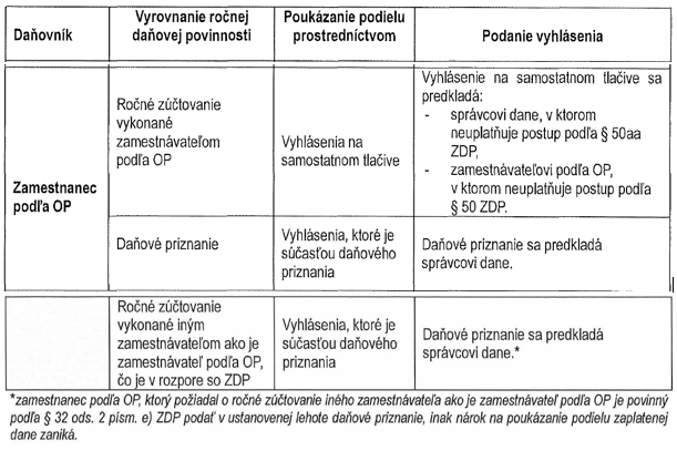 Zamestnanec podľa osobitného predpisu, ktorý nepožiadal zamestnávateľa podľa osobitného predpisu o vykonanie ročného zúčtovania a ktorý za zdaňovacie obdobie dosiahol len zdaniteľné príjmy podľa § 5 zákona o dani z príjmov presahujúce 50 % sumy podľa § 11 ods. 2 písm. a) zákona o dani z príjmov, je povinný podať daňové priznanie k dani z príjmov fyzickej osoby, v ktorom môže poukázať aj podiel zaplatenej dane pre rodičov.